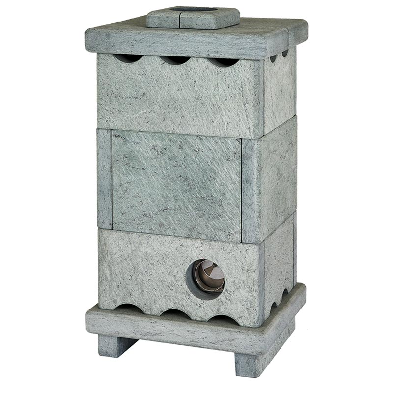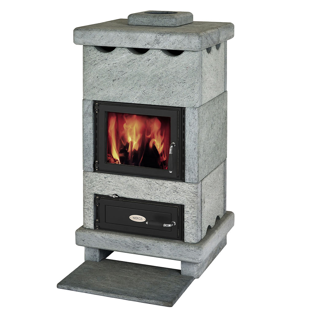 Questa stufa ha il focolare in ghisa e il rivestimento in pietra serpentino.